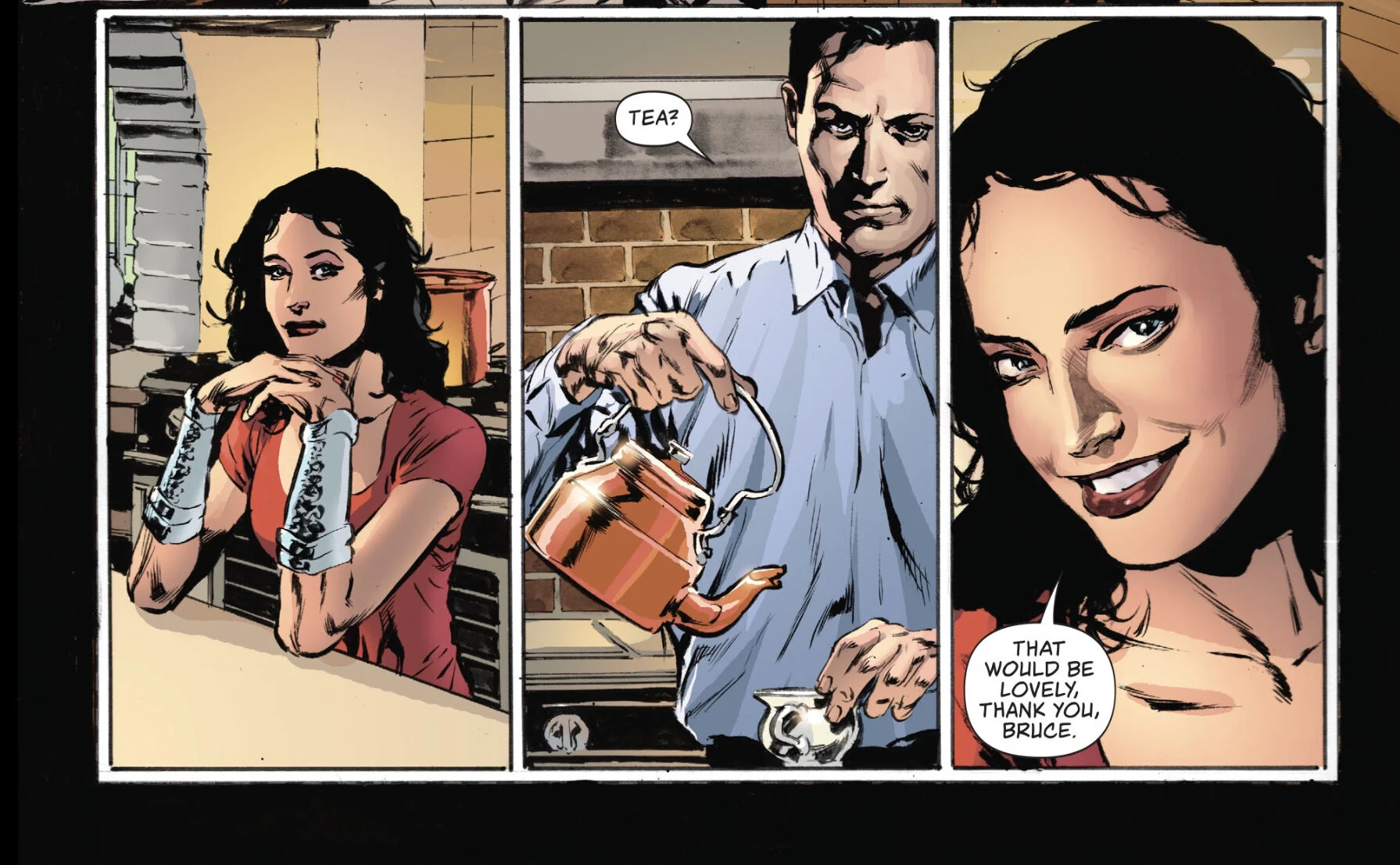 And now for something entirely different. A Greg Rucka-scripted look at the reactions of Batman and Wonder Woman, who discuss Superman’s big choice away from Superman himself, allowing more honesty than they’d previously shared with Big Blue. The way Wonder Woman slowly teases an admission of jealousy out of Batman over the course of this vignette is really well done, with Rucka as always really giving us realistic character moments and motivations. I also think the way Perkins renders the looks on their faces as Batman pours Wonder Woman tea tells the audience so much about the dynamic between the characters.